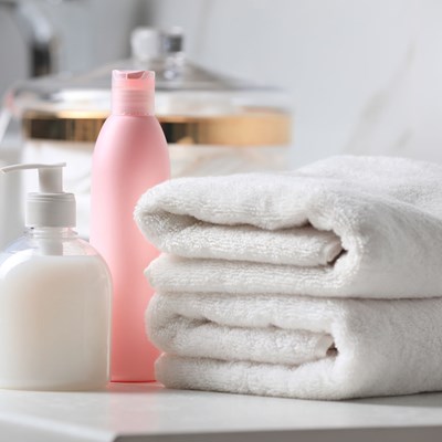 Shampoo, shower gel, toothbrush, vanity set and fresh towels